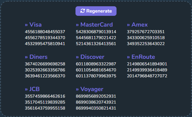 Click regenerate button in order the generate new credit cards numbers.